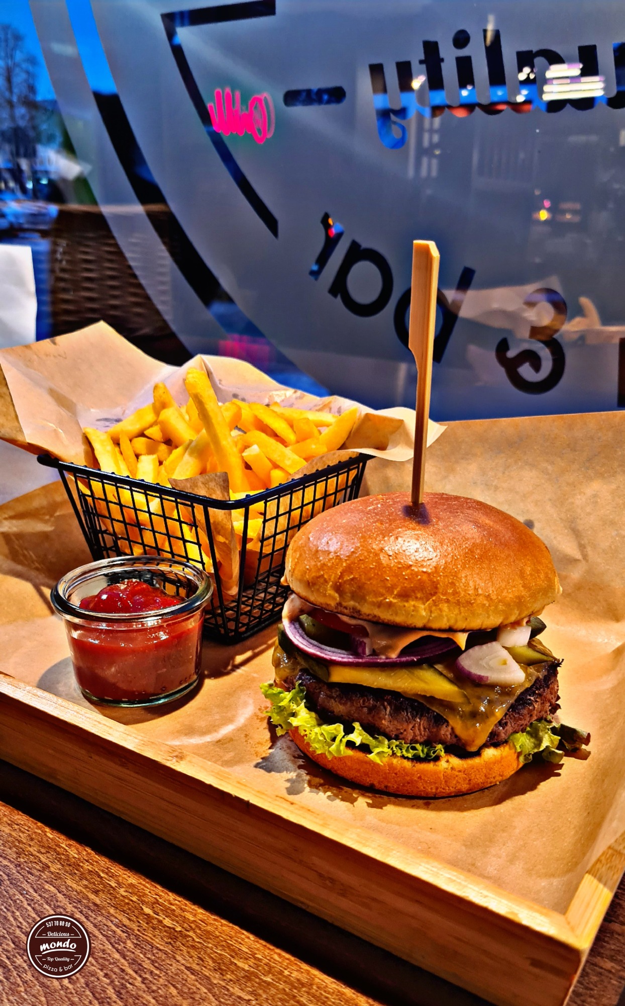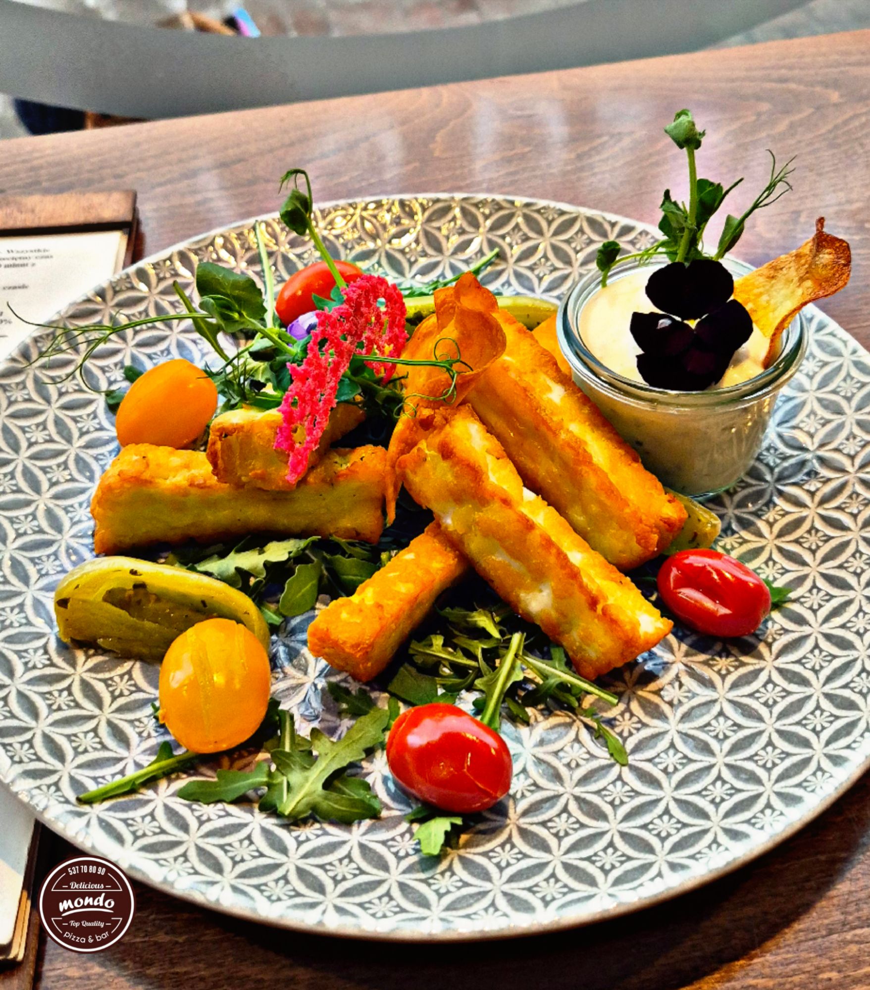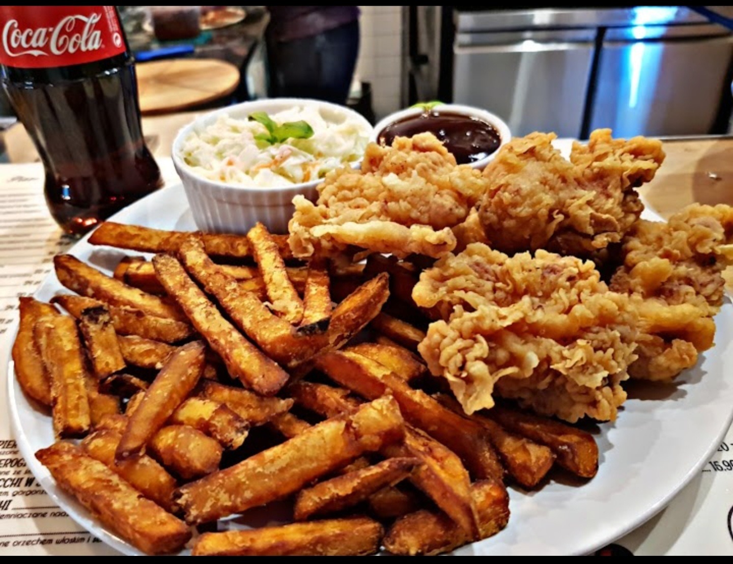 Dania obiadowe podawane z frytkami, ziemniakami, ziemniakami podsmażanymi, łódeczkami i surówką ze świeżych warzyw
