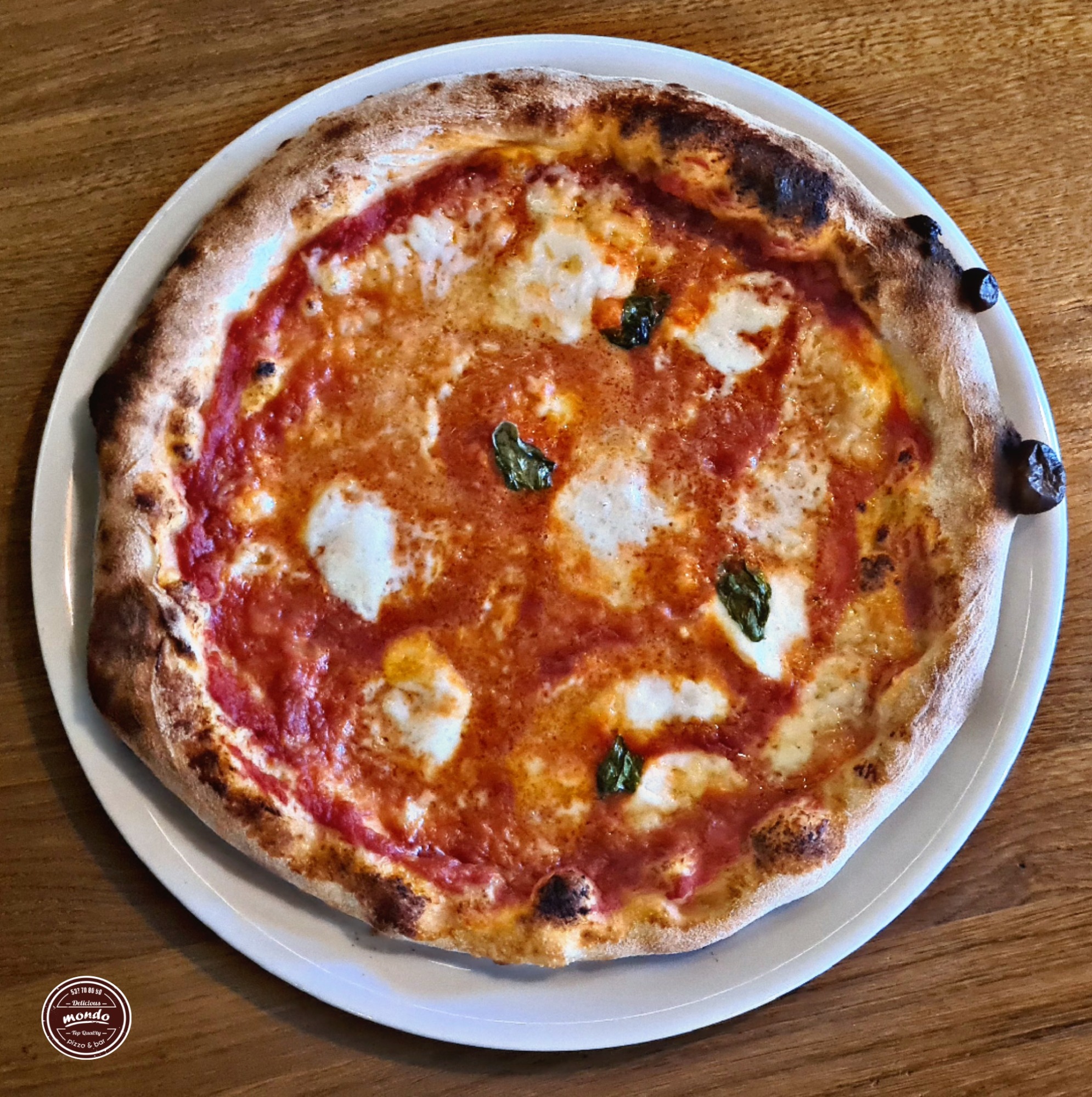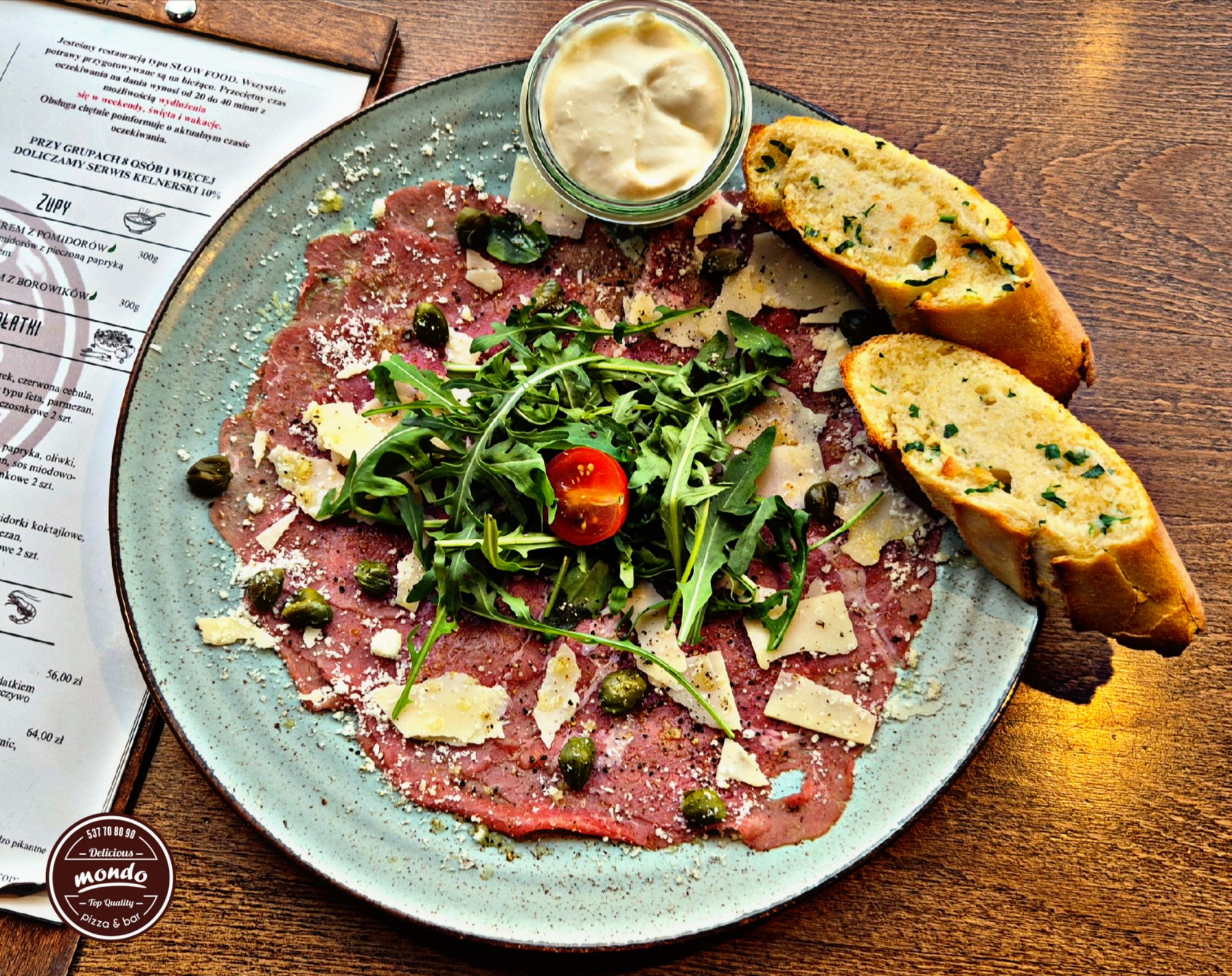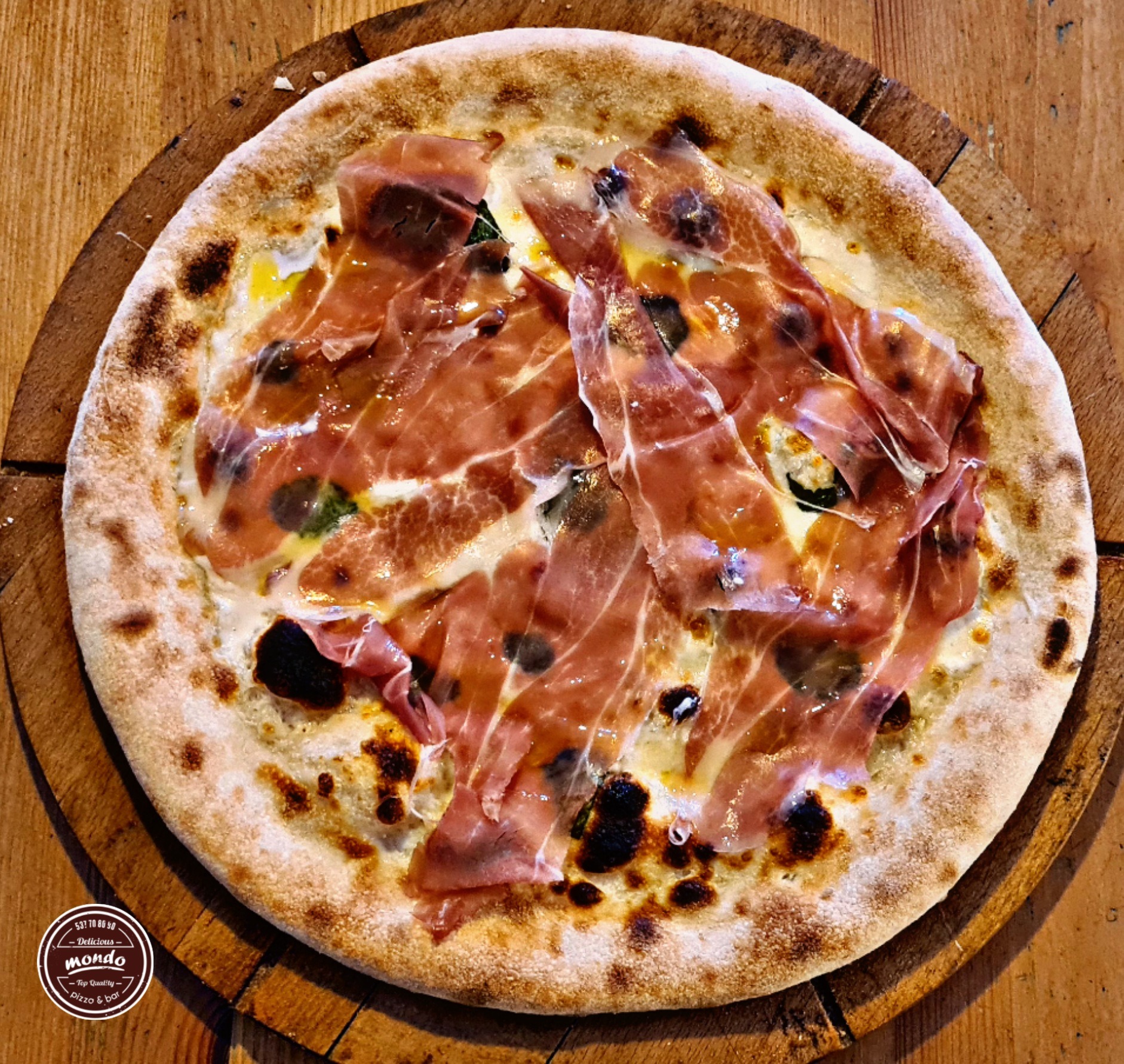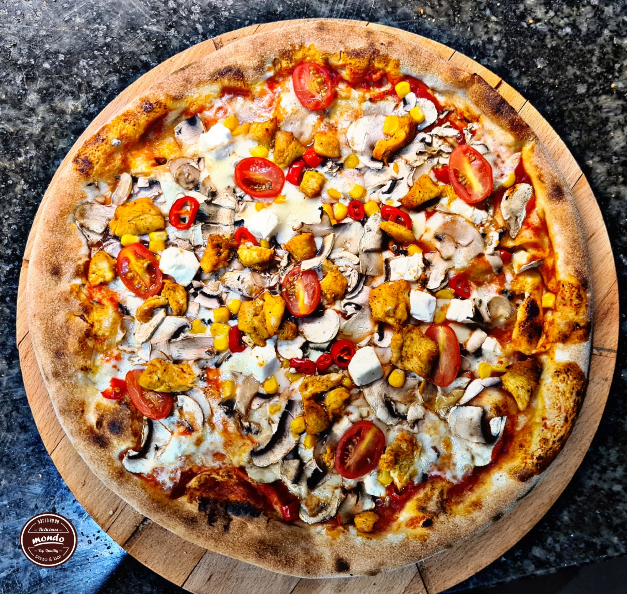 sos pomidorowy, mozzarella, pieczarki, zielone oliwki, cebula, karczochy, pomidorki koktajlowe, rukola, biała mozzarella