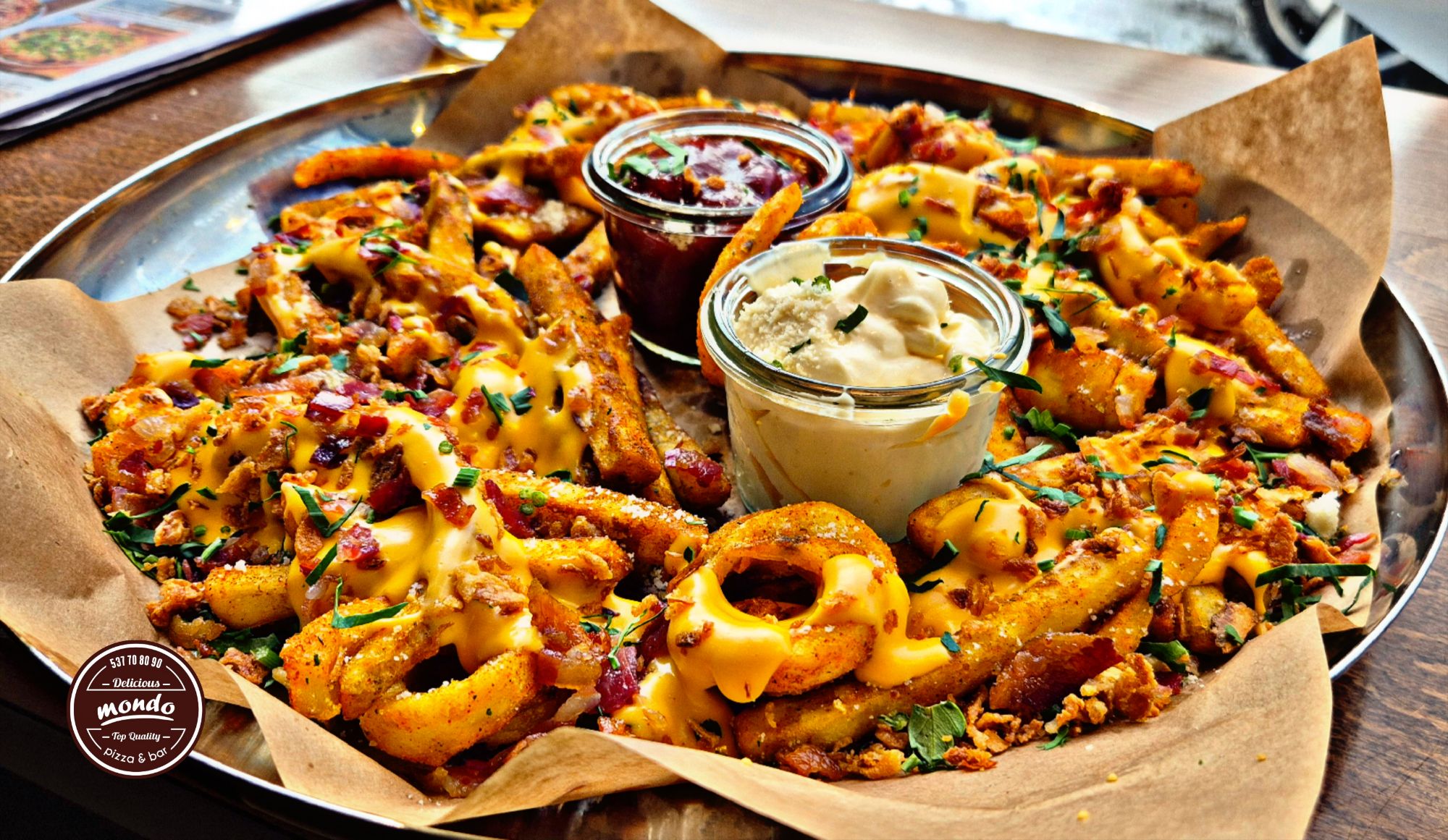 Porcja dla 2 - 4 osób, frytki z gorącym sosem serowym cheddar, pancettą (włoski boczek), prażoną cebulką i parmezanem + majonez i ketchup