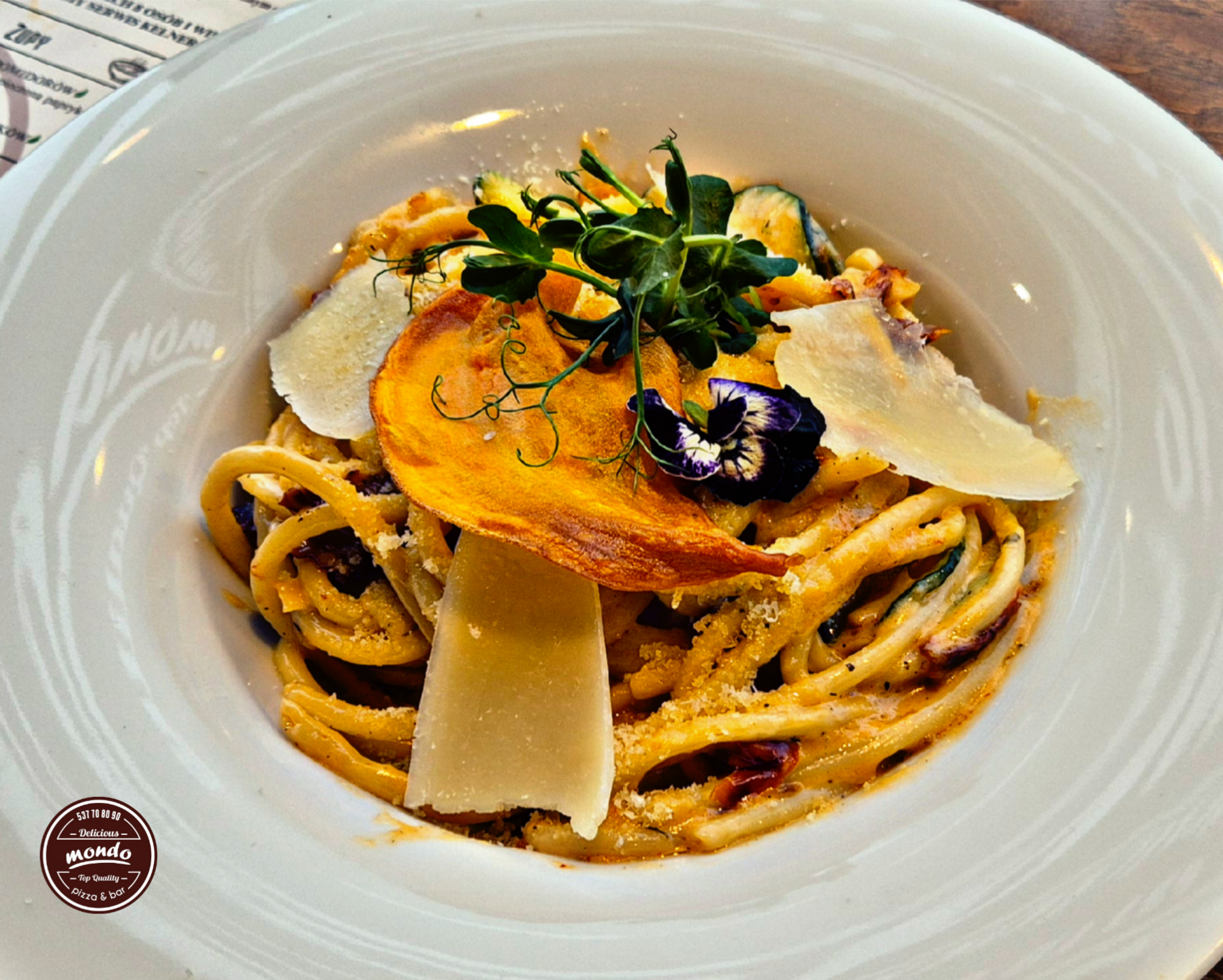 tagliatelle z sosem bolońskim (wołowina, wieprzowina, warzywa), parmezan